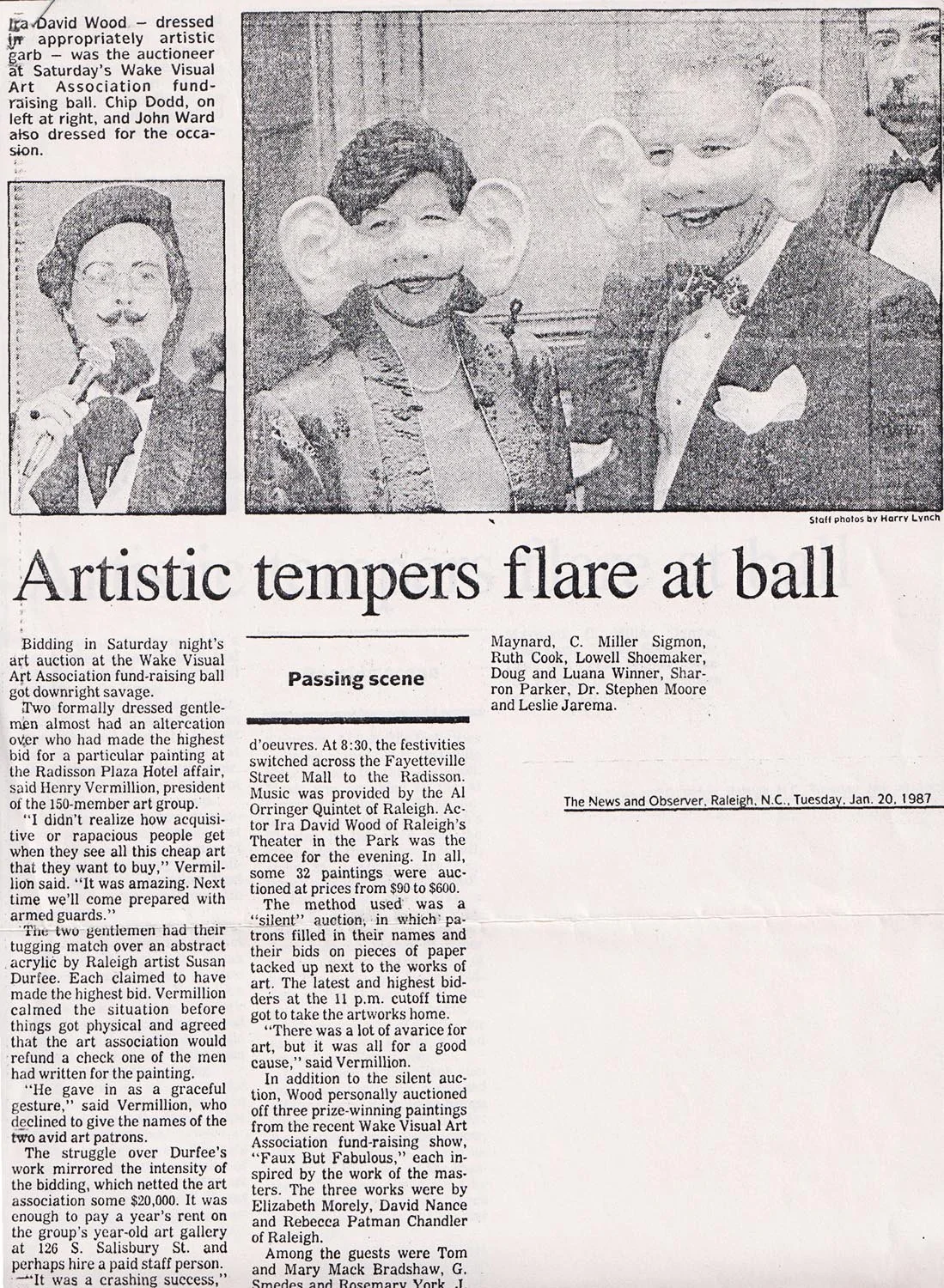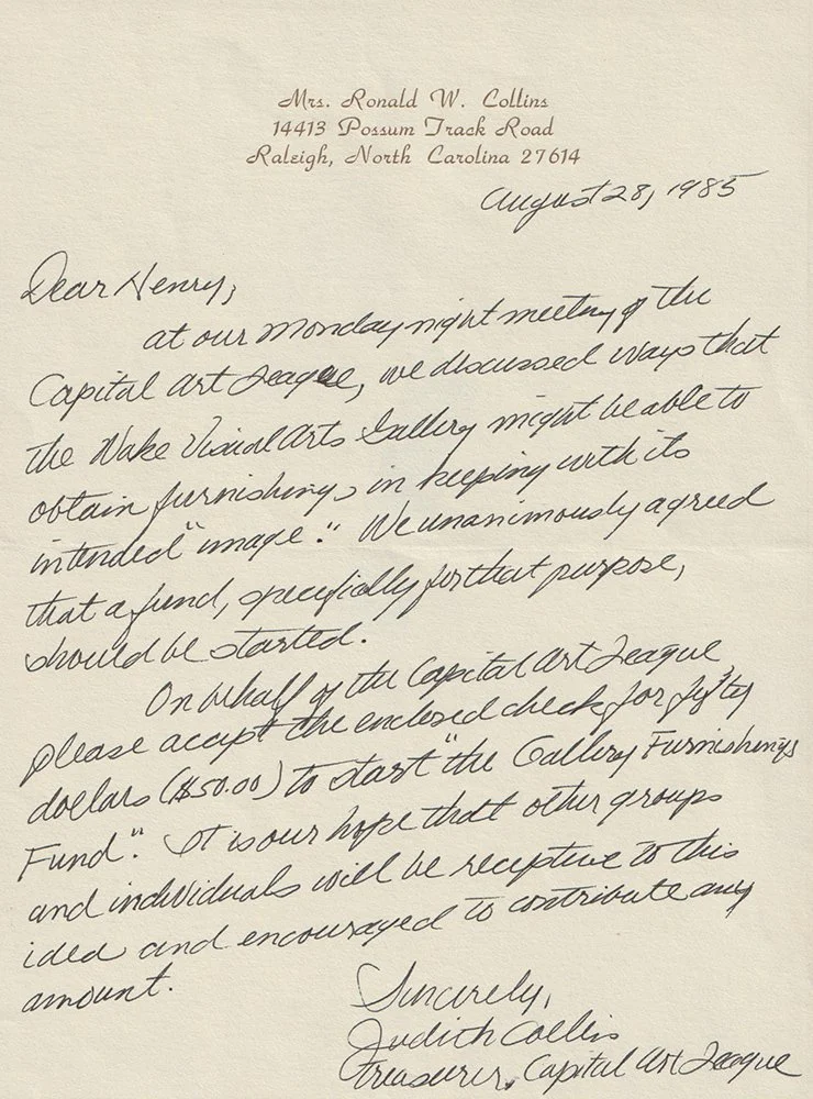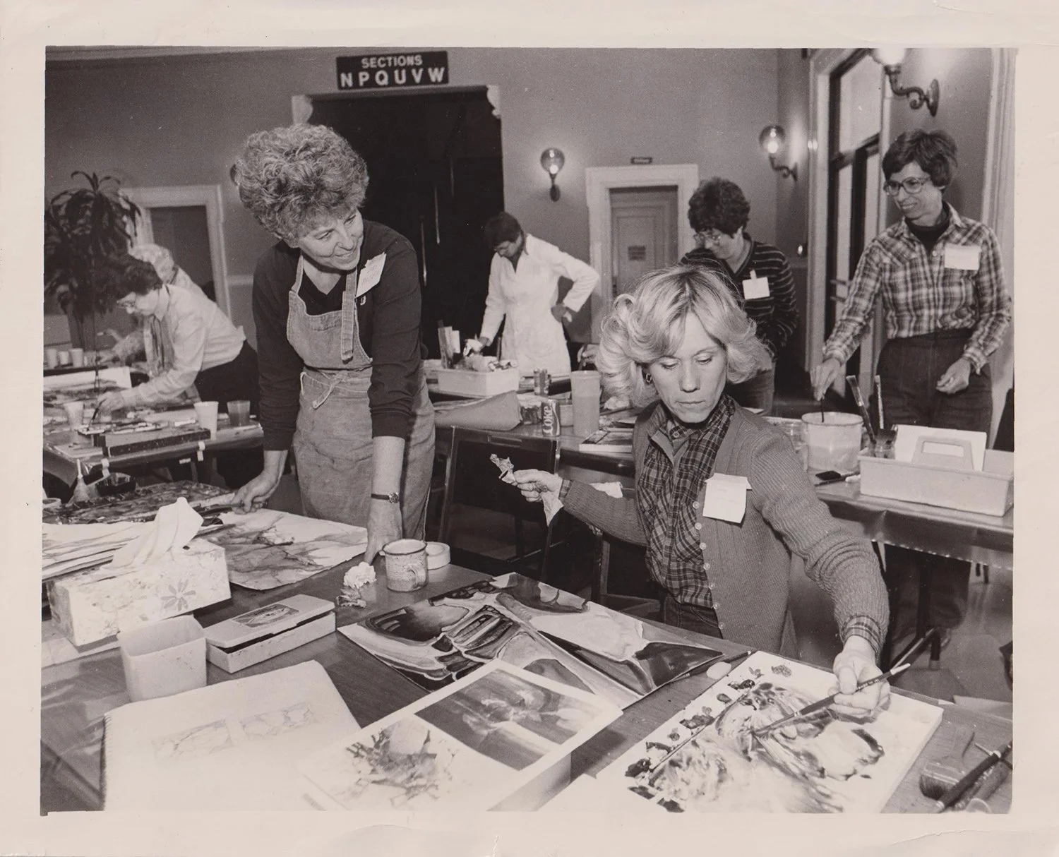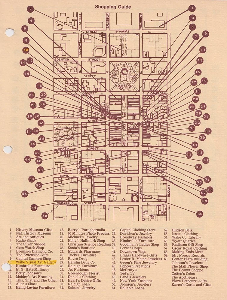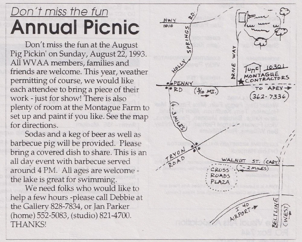 Between 1978 and 1979, the Wake Artists Guild, Raleigh Artists Guild, and the Capital Art League held several potlucks to exchange feedback and ideas. There were discussions concerning the creation of a new arts organization, potentially as a partnership between the triad. An artist named Margot Richter subsequently held several meetings with representatives from these guilds, the North Carolina Arts Council, and the Raleigh Arts Commission. The idea for a new arts organization was agreed upon, and on June 9th, 1980, Paula Harless, Barbara Burnham, and Jane Paden sat around Margot Richter’s Kitchen table to finalize the bylaws and board structure. The Wake Visual Arts Association (WVAA) became incorporated on July 11th, 1980. WVAA held its first meeting at the Sertoma Arts Center of Raleigh, where an artist named Joe Cox presented his Color and Light show to approximately 100 people.